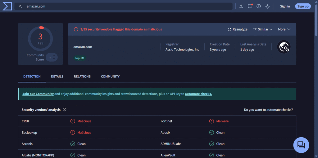 Note: By the way, that shown link earlier is actually malicious. We’ve defanged it for your safety but if you’re still curious, take a look at the VirusTotal results below. (Of course, you can always mess around and find out by going straight to the source 🙂).